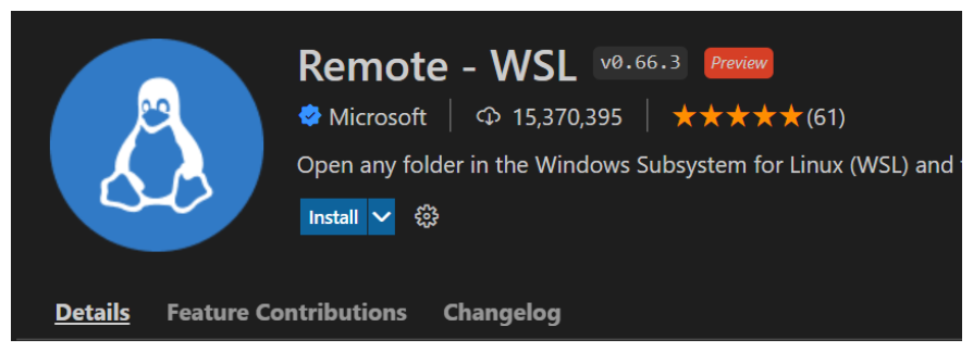 First we need the WSL2 extension for VSCode. Go to https://marketplace.visualstudio.com/items?itemName=ms-vscode-remote.remote-wsl and click the ‘Install’ button.